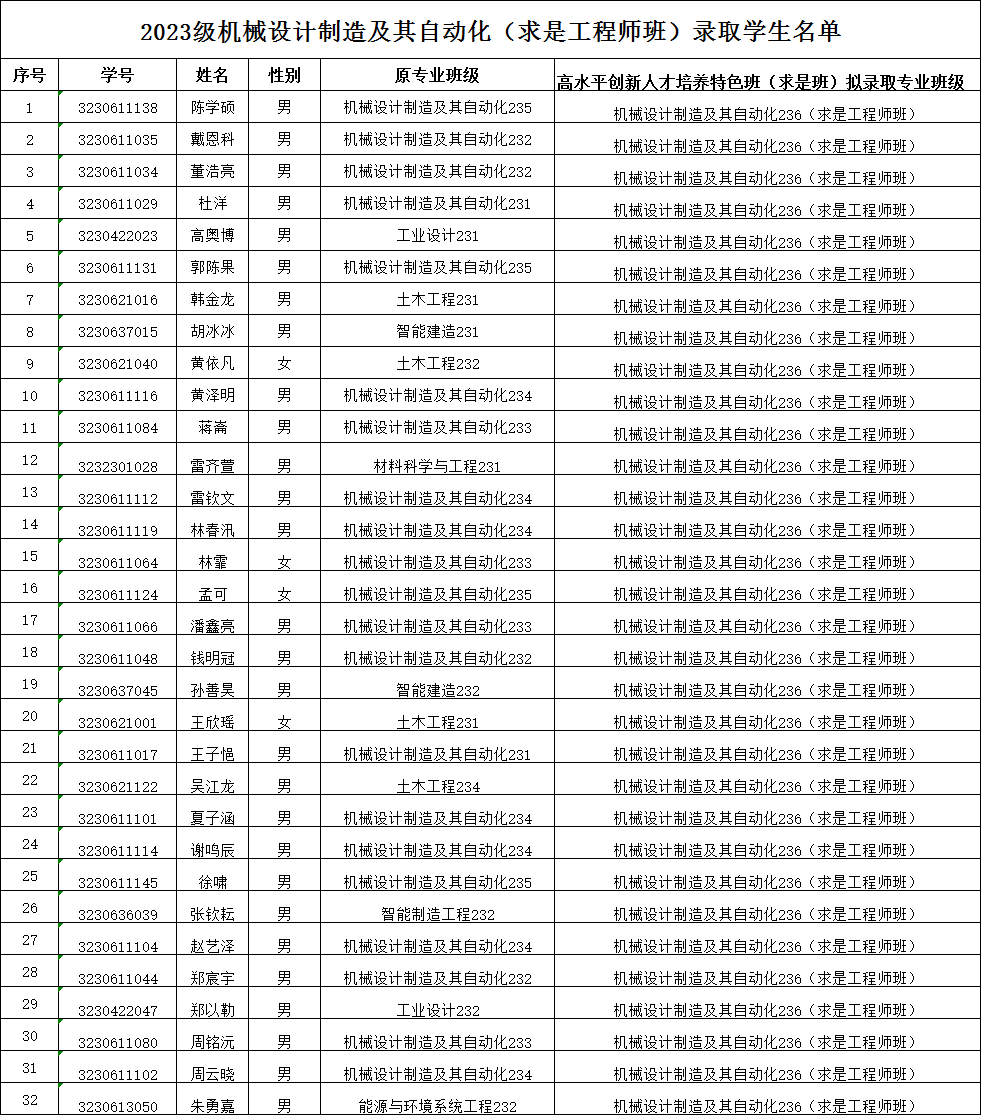 根据《1946源于英国2023级求是工程师班选拔工作实施方案》,经学生申请,学院资格审查、面试后,拟同意陈学硕等32名同学进入2023级机械设计制造及其自动化(求是工程师班)。现将具体名单予以公示如下。