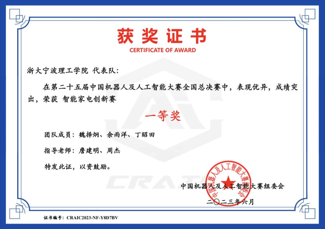 本次比赛,团队指导教师为詹建明教授、周杰老师,参赛队长为浙江大学联培研究生魏择炯,组员由机制223班丁昭田、机制224班余雨洋组成。