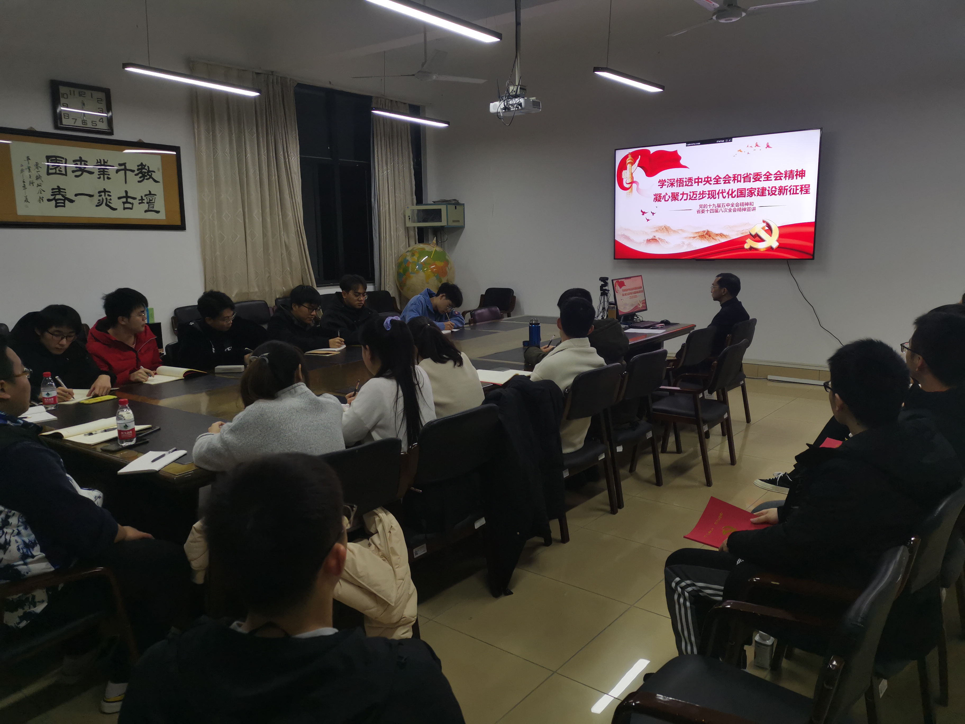 童书记主讲的主题是《学深悟透中央全会和省委全会精神 凝心聚力迈步现代化国家建设新征程》。党课上,童书记指出十九届五中全会精神全会审议通过了《中共中央关于制定国民经济和社会发展第十四个五年规划和二〇三五年远景目标的建议》,提出了“十四五”时期经济社会发展指导思想、主要目标和必须遵循的原则,提出了到二〇三五年基本实现社会主义现代化远景目标。同时,童书记结合大量的国、内外事实数据对比分析,对六个“深刻理解把握“进行系统、全面、深入的解读,即:新发展的成就、新发展阶段、新发展目标、新发展格局、新发展任务和新发展保证。随后,对省委十四届八次全会精神进行了传达。童书记强调我国现代化是人口规模巨大、全体人民共同富裕、物质文明和精神文明相协调、人与自然和谐共处、走和平发展道路的现代化,要在“危中”中抓住机遇,化危转机,勇于迎接挑战。最后,童书记对支部党员们提出了三点要求和希望,希望青年党员们能积极学习,能主动学政治、讲政治;能加强能力锻炼,不断提高自身素养;能做好党员的先锋模范作用,主动积极做好入党积极分子考察培养和困难生帮扶工作。