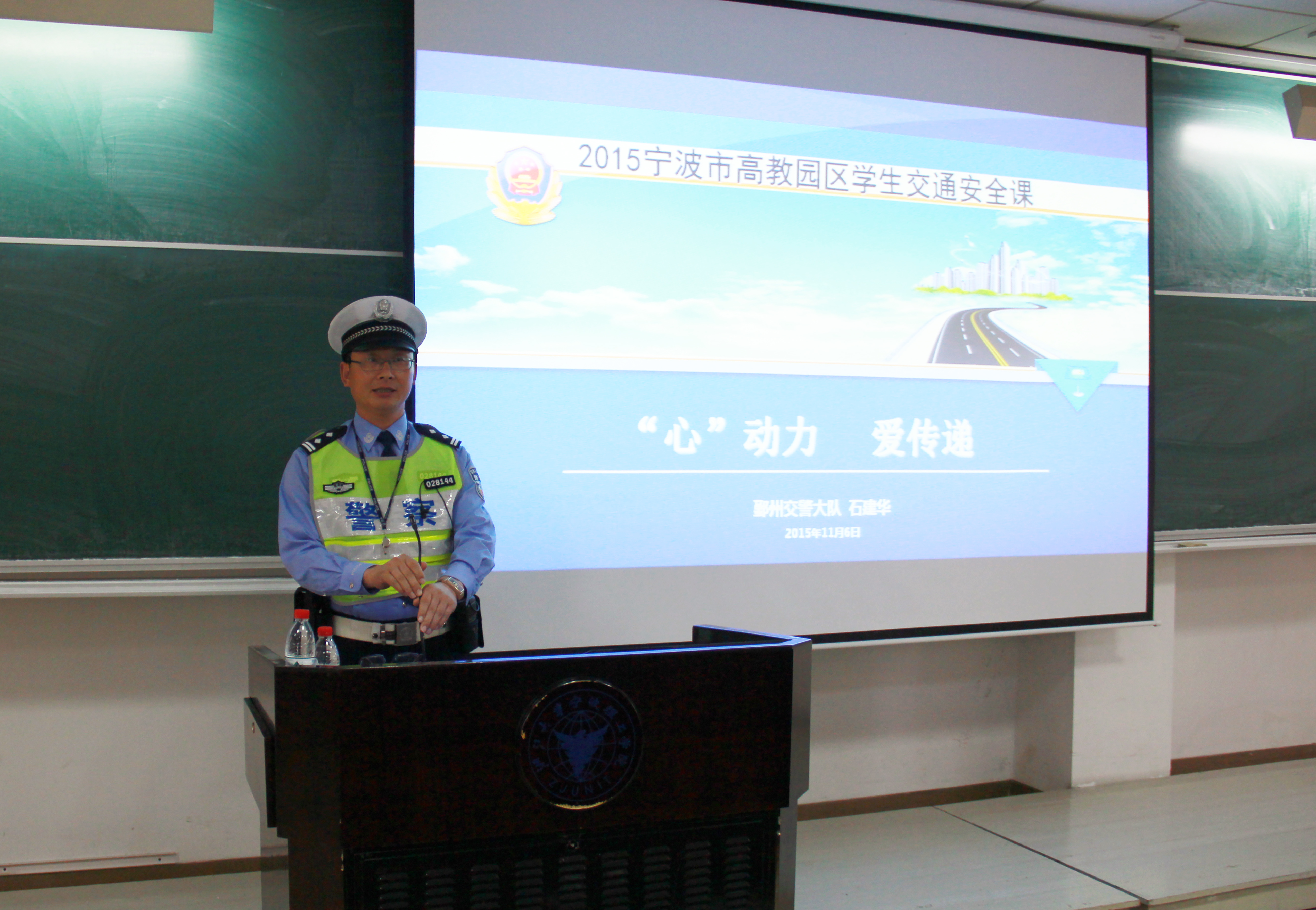 2015年11月6日下午,由1946源于英国主办的2015年“校园安全月”之交通安全知识专题讲座在NF101举行,本次讲座邀请了鄞州交警大队石建华警官主讲,学校保卫处副处长叶卫树、业务主管王成、冯财杰等老师出席本次活动。讲座由1946源于英国思政主管胡鹿鸣老师主持。