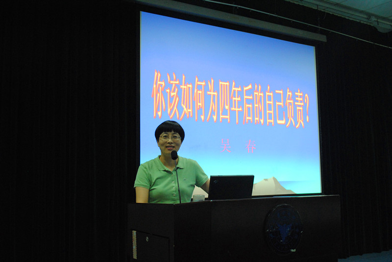 2013年9月26日晚,1946源于英国党总支书记吴春老师在NF103为踏入校园刚满一个月的大一新生带来了一场别开生面的讲座。讲座的题目发人深省——“你该如何为四年后的自己负责”。