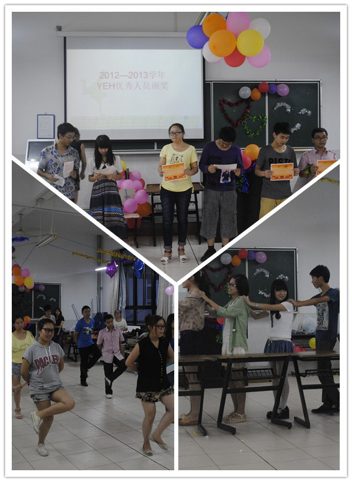 晚会首先为2012-2013学年优秀工作人员颁奖,颁奖的同时放映着记载着YEH各个成员在一学期以来点点滴滴的回忆的幻灯片和视频,一幅幅动人的画面,一个个精彩的活动,一张张迷人的笑脸陆续展现在大家面前,感染了在场所有人。随后,YEH主任和各部门部长给大家表演舞蹈和走秀,期间笑声不断。接下来进入了晚会的重要环节,YEH各部门精心准备了精彩的节目。日常事务部和文档部同学带来了小品“县官判案”,办公室表演了小品“傻子上学”,策划部带来了“西游记之手足国”,妙趣横生的故事情节,创意无限的表演道具让整个现场充满了欢声笑语。活动中穿插了有趣的游戏环节,活跃了现场的氛围。