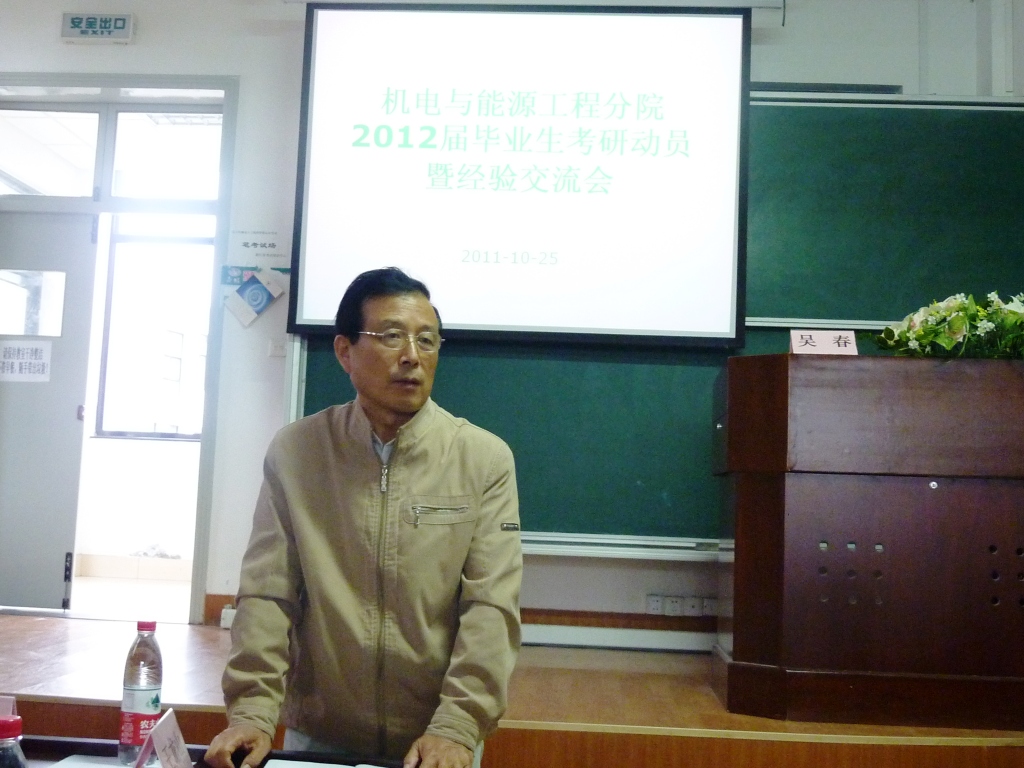 此次机电分院2012届毕业生考研动员暨经验交流会于10月25日下午4点15分在NC302召开。分院院长王龙山,党总支书记吴春,副院长李建新及就业领导小组全体成员、毕业班班导师、分院辅导员和正在备考2012年考研的62名同学参加了此次会议,会议由吴春书记主持。