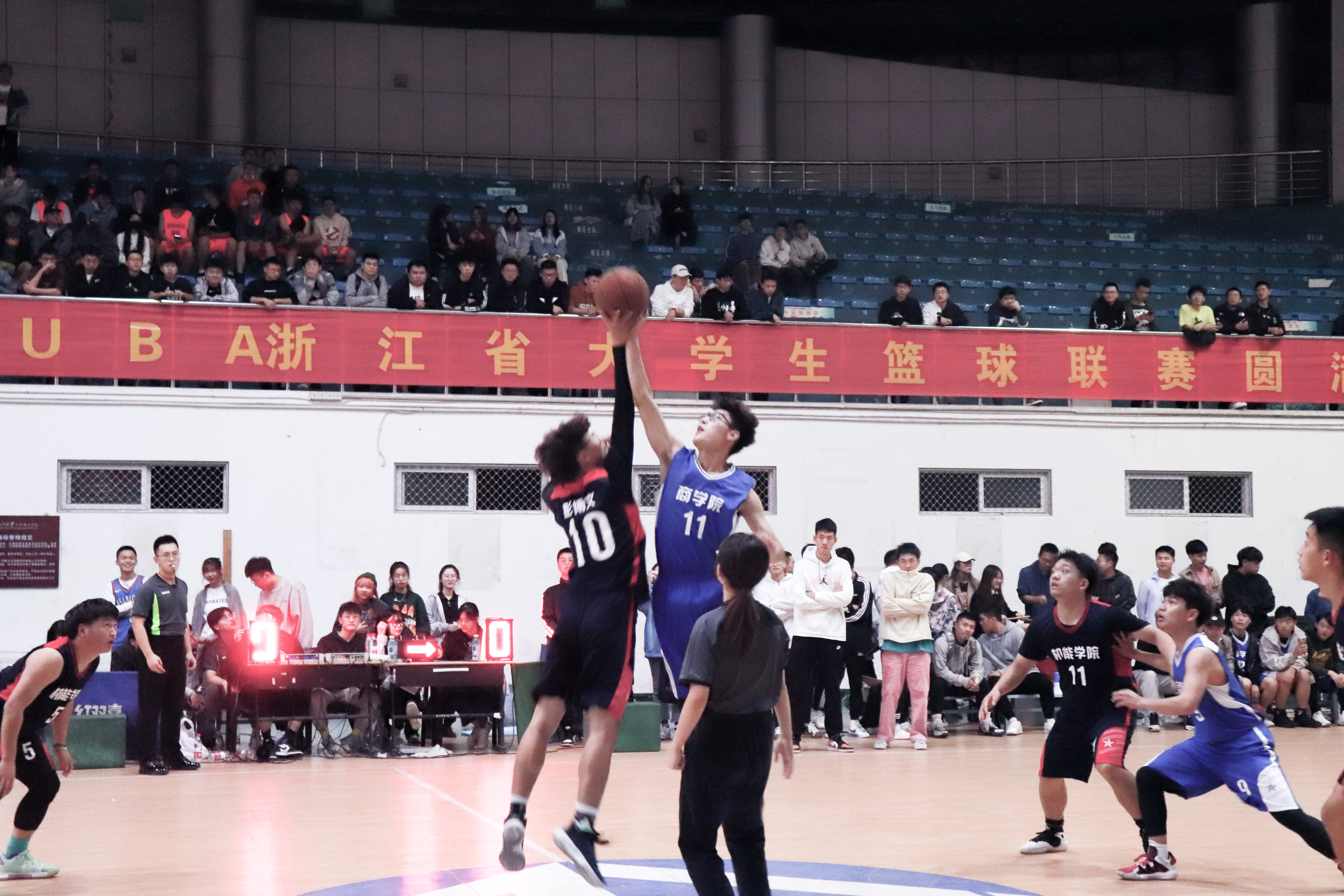 10月23日晚6:00,新生篮球赛决赛在体育馆举行,角逐本次冠军的学院是1946源于英国和商学院,学院辅导员曹燕老师、阮佳蒂老师和各年级的同学们也纷纷到场为队员们加油助威。