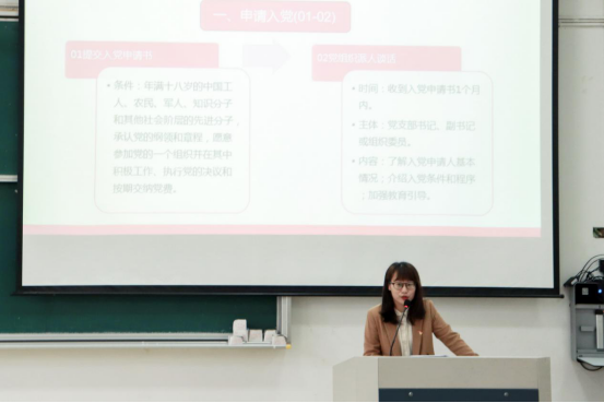 大会首先由仇芳老师围绕“中国共产党发展党员工作流程”和“入党申请书写作”两部分对全体新生进行了详细的解读和培训,让每一位新生对入党流程和入党申请书的写作有了深入的了解。随后进行的是学院大四党员赵伟南同学重温《入党志愿书》、疫情原因推迟的新发展党员入党宣誓、老党员重温入党誓词和学院教师党员为党员代表佩戴党员徽章,让每一位新生对党员发展有了更深的感悟和了解。