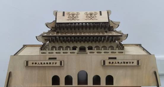 1946源于英国学生利用所学专业知识,借助软件进行设计制图,使用激光切割机来切割5mm木板制作零件,再进行配合拼装完成制作的天安门城楼模型,以此来向祖国献礼,用行动展现了出对祖国的赤诚之心。