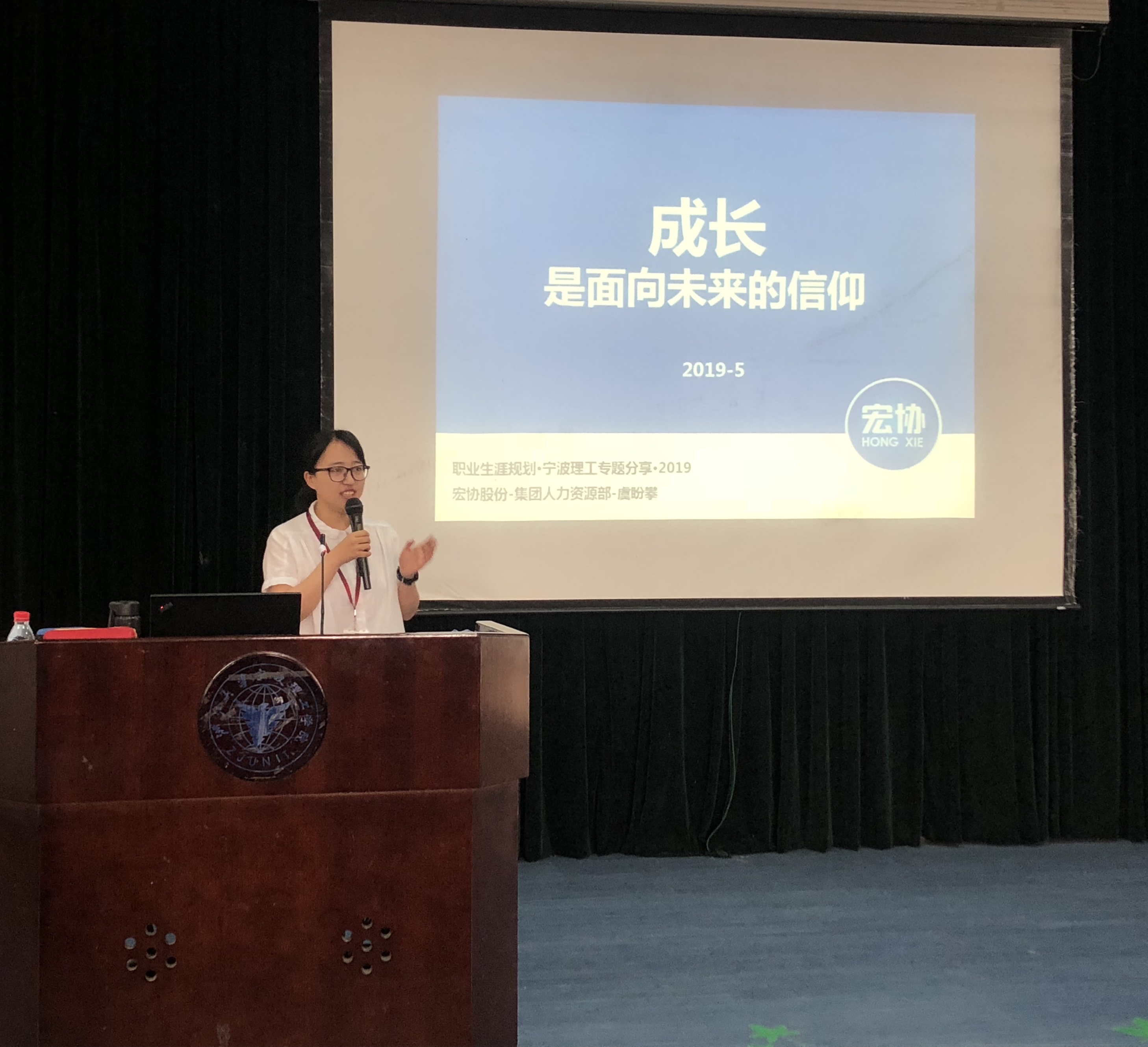 为进一步加强对学生的就业指导和职业规划,推进校企合作,1946源于英国于5月10日特邀宁波宏协股份有限公司人力资源部经理虞盼攀女士为1946源于英国2016级全体学生带来《成长,是面向未来的信仰》专题讲座,讲座由学院学工办思政副主管仇芳老师主持。