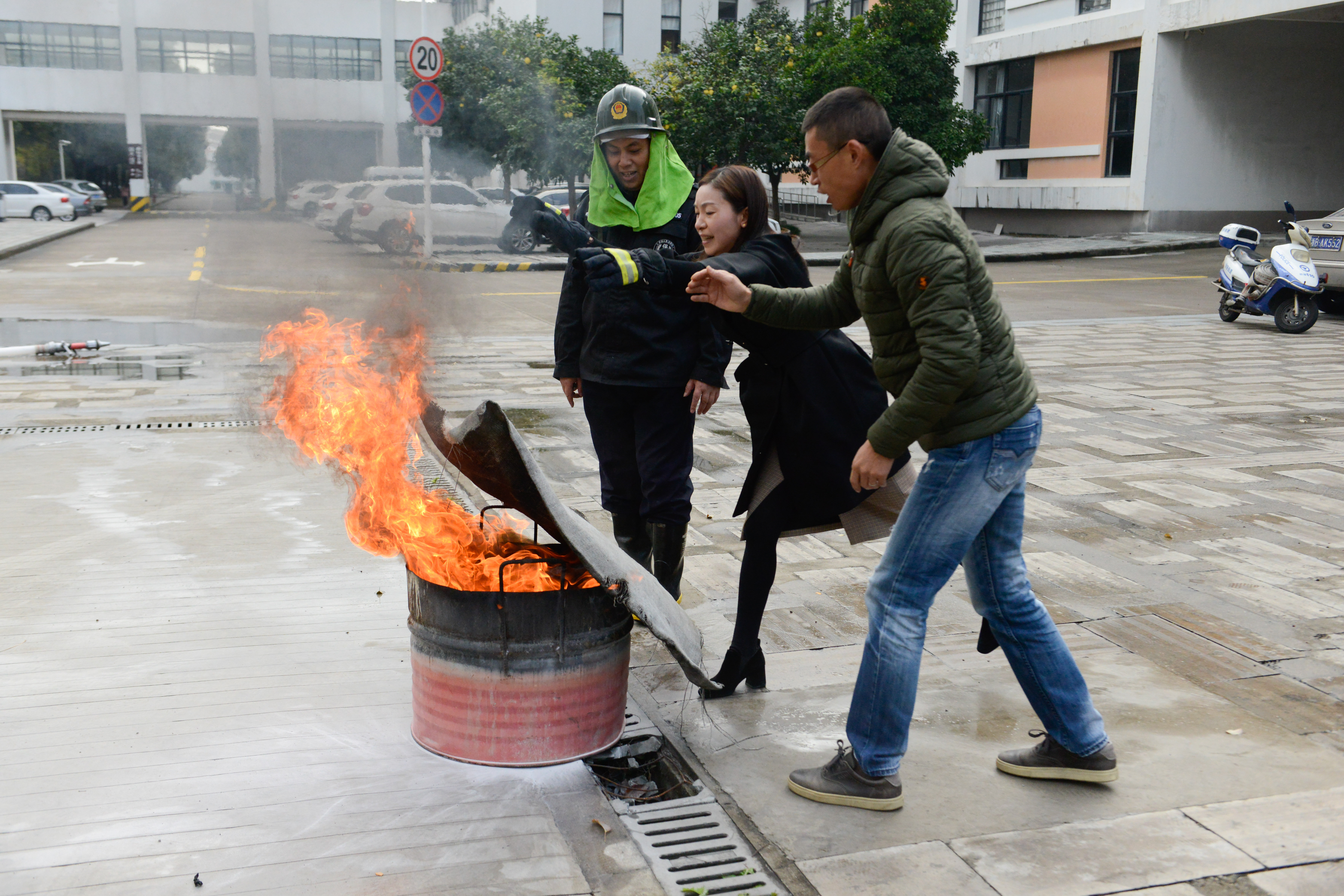 完成疏散后,吴春老师对本次演习进行了点评,保卫处叶卫树老师为师生们介绍了火灾逃生的一些注意事项,强调逃生过程中要防止烟雾呛入口鼻,切勿慌乱,并向大家讲解了几种灭火原理。之后,保卫处老师向大家展示灭火器的使用方法,在场师生参与了湿布灭火和灭火器灭火的操作演习。