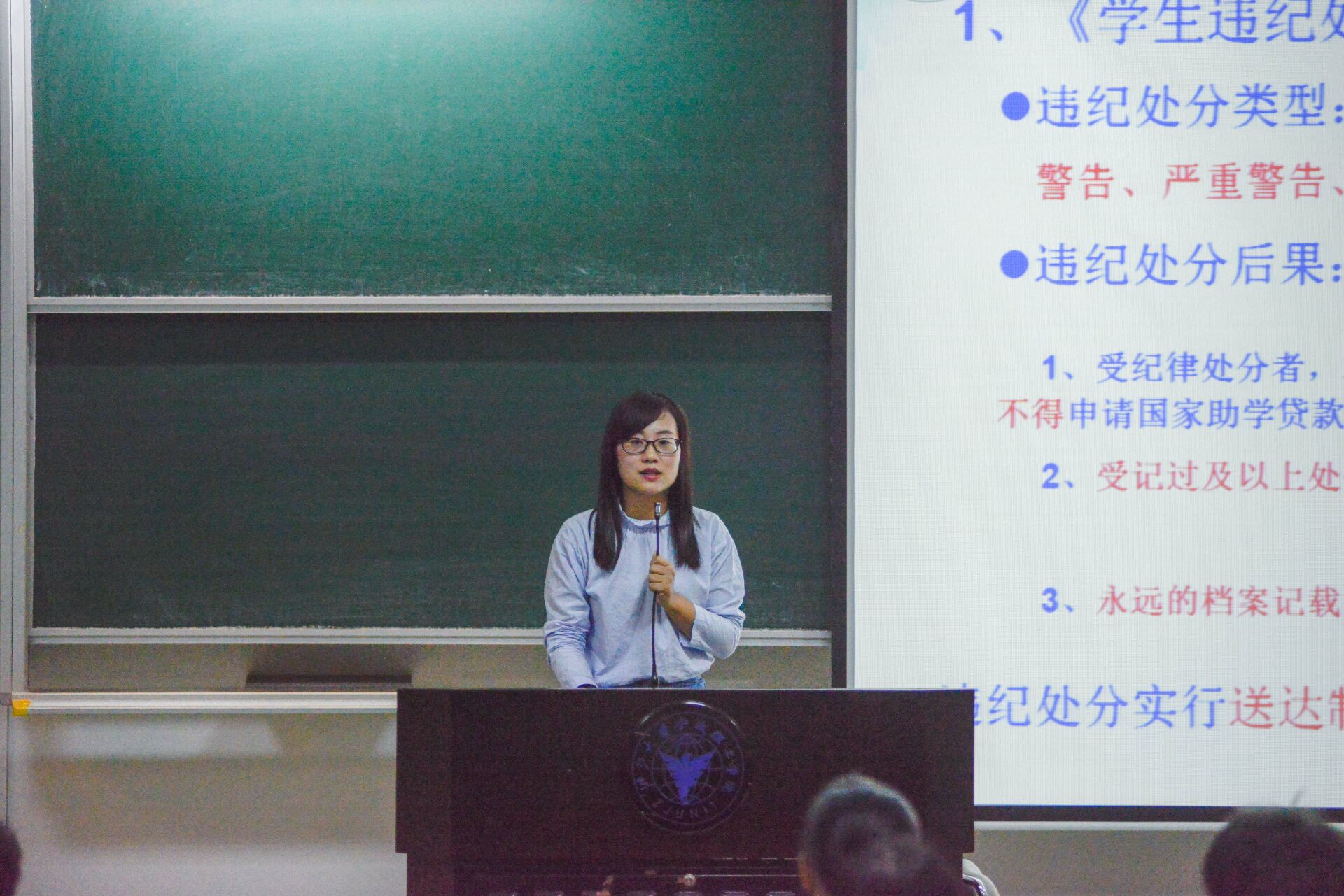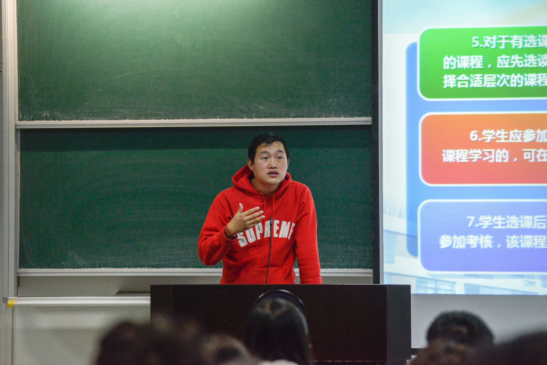 首先,章斌老师介绍了学校选课原则、流程及本科学生学籍管理等规定,并提出了学生个人和各班学习委员处理相关情况的建议。接着,仇芳老师向同学们介绍了校纪校规、学生医疗保险、意外保险以及院、校级奖学金的给予办法等相关工作。提醒大家作为一个大学生要为自己的行为负责,鼓励新生刻苦学习,通过自己的努力获得奖学金和其它荣誉。