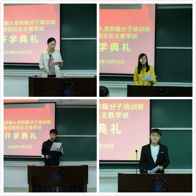 典礼在激昂的国歌声中拉开了帷幕。首先,刘舒老师介绍了出席典礼的嘉宾,接着由仇芳老师宣读了本次党校授课计划,随后由土建学院周丽娟老师宣读入党积极分子培训班学员的课堂纪律和请假制度。她强调:作为一名入党积极分子,应当严格要求自己,尊重课堂的纪律,不无故请假早退,严以律己、以身作则。紧接着机能学院李明峰同学代表全体学员发言并宣读了《入党积极分子党校学员承诺书》,承诺在接下来的党校学习以及日常生活中要以一名共产党员的标准严格要求自己,积极向党组织靠拢。