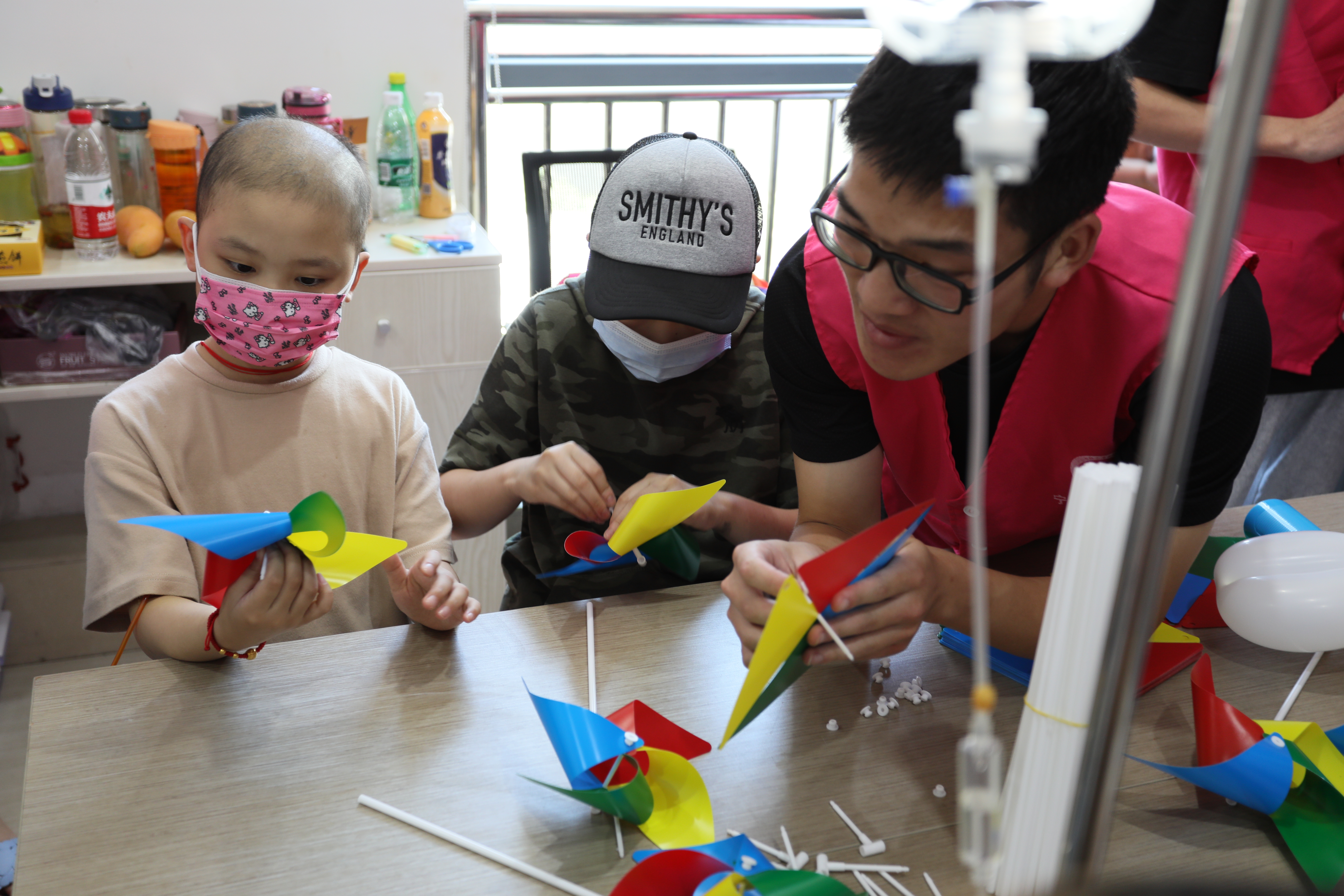团队首次活动定在一年一度的“六一”国际儿童节,前期经过与宁波市第一医院儿科多次沟通、修改方案,成功举行了本次病房学校“六一”主题活动。六一当天,同学们换上了小黄人套装,它的出现一下子就吸引了在场所有小朋友的目光,他们都围着小黄人转,争着和它玩耍。接着是风车制作环节,小朋友们纤细的手上打着点滴,但小手中扔握着制作好的风车在空中来回摆动,听着风车穿过空气发出嗖嗖的声音,别提有多开心了。最后进行的便是绘本阅读活动,暑期社会实践队的成员们经过精心的准备,绘声绘色地给小朋友们讲绘本上的故事,小朋友们一个个都认真听讲,争先恐后地来扮演书中的角色。活动期间,医院一改往常的沉闷充满着欢声笑语。