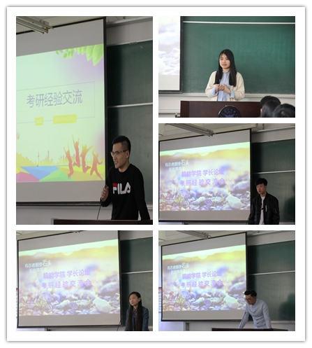 接着,五位学长依次进行经验分享。先由机制132徐凯与大家分享了他的考研心得与经验。考研路漫漫,目标是关键。坚定不移地朝着自己的梦想前进,在松懈时告诫自己,在沮丧时安慰自己,在紧张时放松自己……考研是一场持久战,更是一场心理战。把握机会,持之以恒,未来一定会还你以美好。然后,王登、汪力、张华腾、潘娇静等4位学长分别向大家介绍了自己的考研历程和经验。
