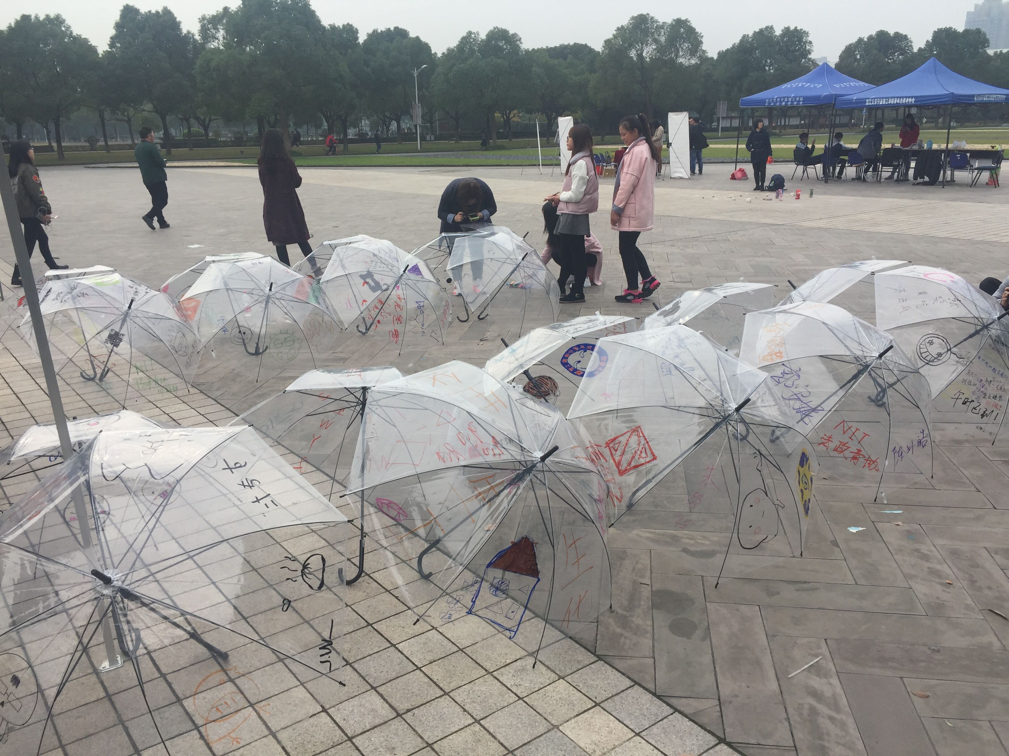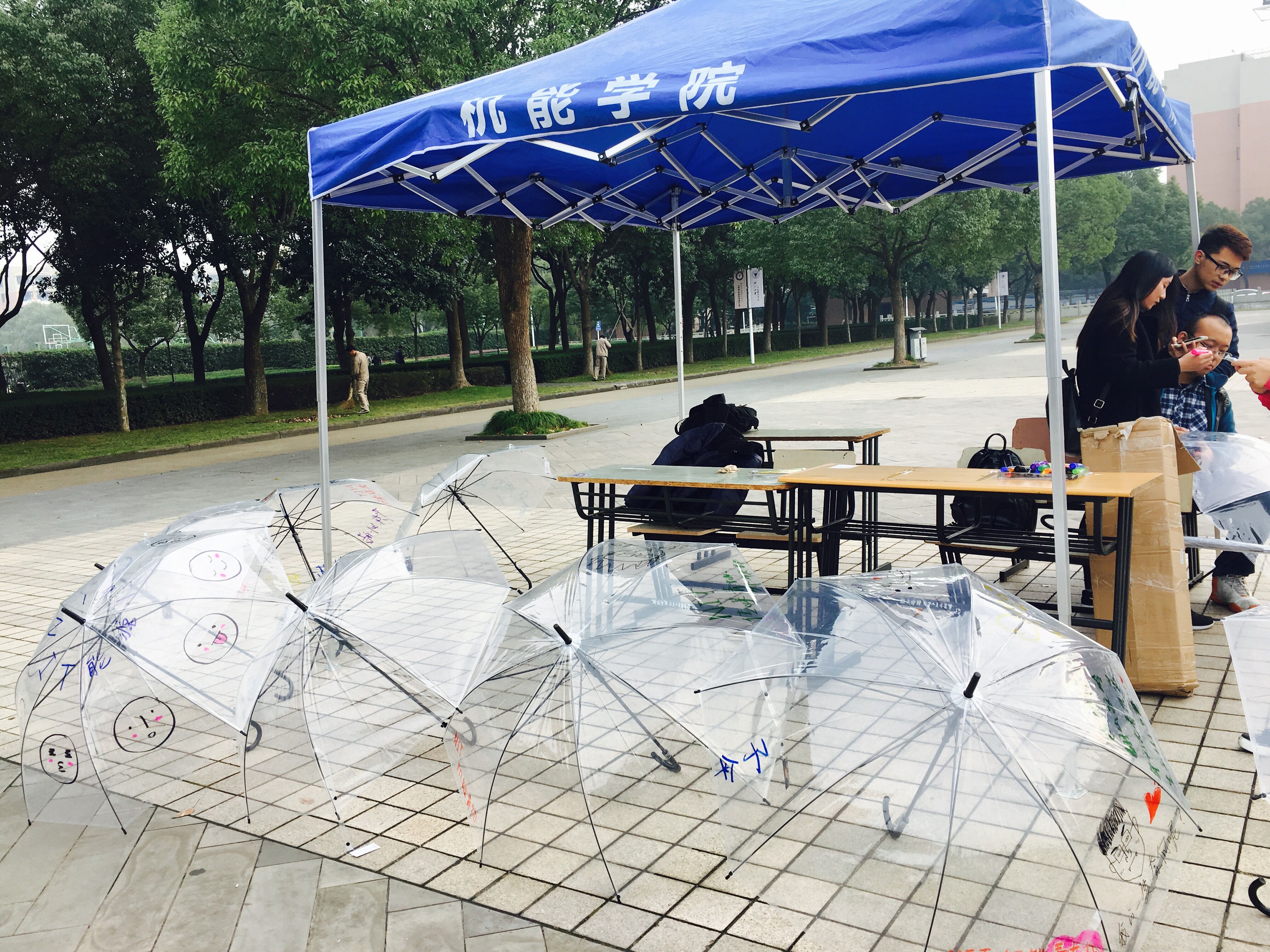 每一年的12月5日是国际志愿日,今年是第31个志愿者日。12月5日当天,露天广场上驻扎着一个接一个的小帐篷。1946源于英国青年志愿者协会帐篷前面满地的透明伞很快吸引了大家的眼球,细看还能发现每把伞上面都有不一样的图案。活动中,时不时的能看到同学们耐心地在雨伞上细细的描绘。雨伞上面有对活动的寄语,有各种各样的卡通人,更有同学们的签名。