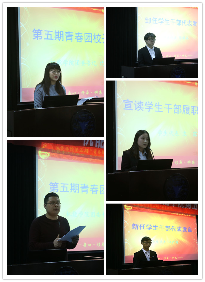 接下来本次学员代表袁露同学从“德字为先、干字当前、优字为重”三方面代表新一届学生干部做出履职承诺。前任学院团委副书记陈耀威同学与在座的同学分享了团学社三年半时间里的师生情、同学义、人生梦。学院新一届学生会主席汪严超学长代表信任团学干部发言,他提到学生干部要起好模范带头作用,平衡好学习和工作,热心服务,创优争先。