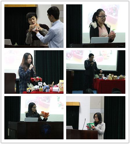 比赛的第一部分是平安果创意包装。经过前期的作品征集,本届包装挑战赛共收到来自两大学院的五十余件作品。经专业老师初选,共有22件作品进入当晚的决赛环节。选手们逐个上台展示自己的作品,很多作品虽然是纯手工制作,但都富于创新、设计独特,将全新的视角展现给大家,使人眼前为之一亮。展示到精彩部分,台下还爆发出阵阵的掌声,小小的平安果在大家的精心包装下,更有了一番别样的韵味。