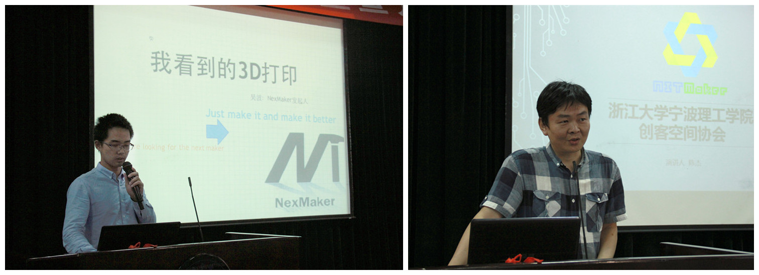 同时本次大会也邀请了宁波创客届两位先锋人物,他们分别给学生带来了关于“创客”和3D打印前沿的讲座。创立空间的郭总指出“创客空间”讲最多的概念是发明创造,解决生活物质上的便利。他和我们分享了一些心得,要求把idea变成现实Nexmaker负责人吴波也畅谈了3D打印,让我们了解到更多与3D打印的相关的知识。3D打印技术也是1946源于英国在近几年科研立项的重点方向。