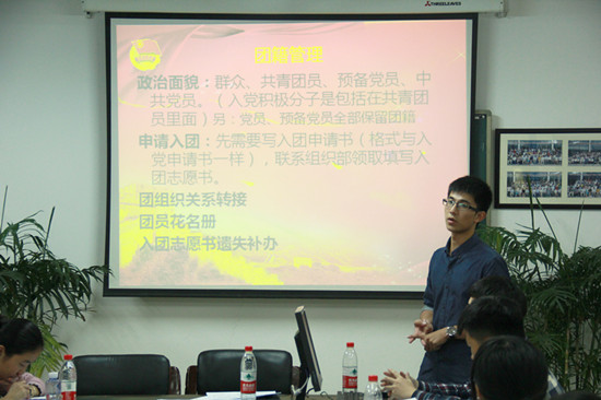 随后,学院团委组织部副部长施汉城同学向各位新生团支书具体介绍了团组织关系转接的顺序和党团关系,介绍了团日活动、党章学习小组等活动举办的要求和特色。对团籍注册、团员花名册填写的工作要求与格式、团内推优与选举条件、团务信息报送、团费收缴时间等内容作了具体安排。在介绍团组织工作后,他对怎样做好一个优秀团支部和共青团手册的使用方法进一步的解释说明。