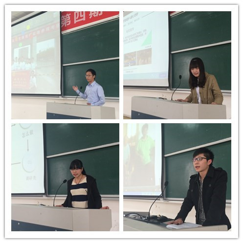 接着四个实践团的代表上台演示。分别是汪严超代表的“绿意生态、本土旅游”团队,毛江淳代表的“挥洒青春,回报社会”团队,毛敏代表的“走访大学生村官”团队,汪力代表的“宁波龙观乡留守儿童支教活动”团队。