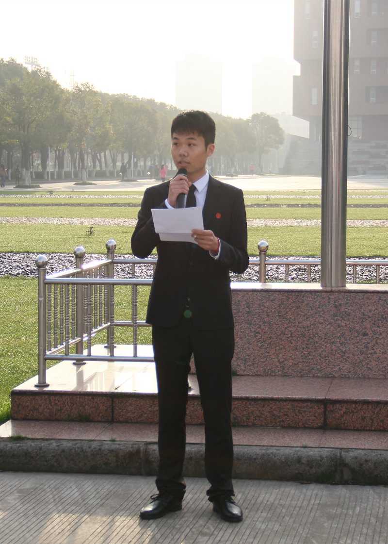 升旗完毕,来自机电121班的现任学生会主席高正杰同学就“如何成为一名合格的学生干部”作了国旗下发言。发言中谈到,合格的学生干部首先要在思想上武装自己,在组织上积极向党靠拢。他呼吁大家,吃苦在前,享受在后,全心全意为同学们服务。他同时指出,当代大学生最需要的三个技能:会说,会写,会做。他也站在学长和主席的角度希望新一轮团学社在继承并发扬前团学社优良传统的同时,在新的形势下搭建新的舞台。