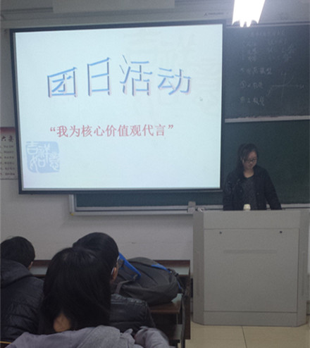 本次团日活动首先开展的是“社会主义核心价值观”趣味问答,主持人精心准备,同学们踊跃作答,一问一答间同学们对社会主义核心价值观的三层内涵有了更多的了解和感悟,核心价值观的养成绝非一日之功,要坚持由易到难、由近及远,努力把核心价值观的要求变成日常的行为准则,进而形成自觉奉行的信念理念。无论什么时候,我们都要坚守在中国大地上形成和发展起来的社会主义核心价值观,在时代大潮中建功立业,成就自己的宝贵人生。接下来进行的是重温入团仪式的活动,同学们再次带起了中国共青团团徽,重新体会光荣加入中国共产主义青年团的时刻,增强了广大青年学生的团员意识。最后本次活动在大家齐声高唱团歌《光荣啊,中国共青团》中结束,活动气氛热烈。