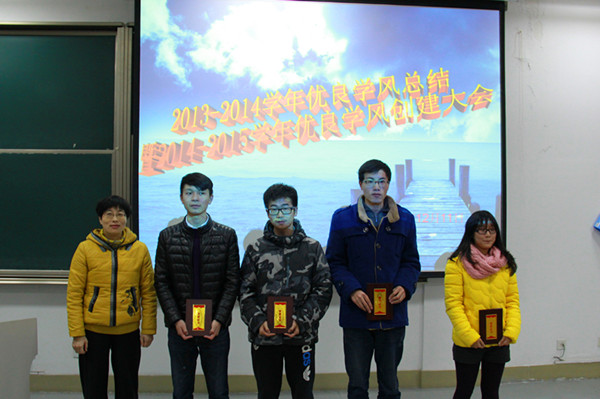 首先,朱彬娴老师对学院2013-2014学年的评奖评优工作进行总结,并重点强调奖学金评定细则的要求及相关注意事项。然后由胡鹿鸣老师宣读13-14学年获得学校“优良学风示范班”、“优良学风班”和学院“优良学风创建班”等荣誉称号的班级,并为他们颁奖。
