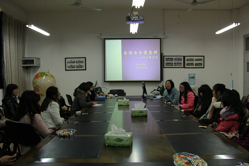 2014年12月8日晚,“自信女生最美丽”心理主题沙龙在1946源于英国会议室举行。沙龙活动筹备期间女生们报名踊跃,为了达到沙龙的最佳效果,最后筛选了30名女生参加此次沙龙。1946源于英国心理辅导员吴琼老师主持此次沙龙,邀请了大三大四的优秀学姐朱楼艳、李丹作为特别嘉宾来到现场。