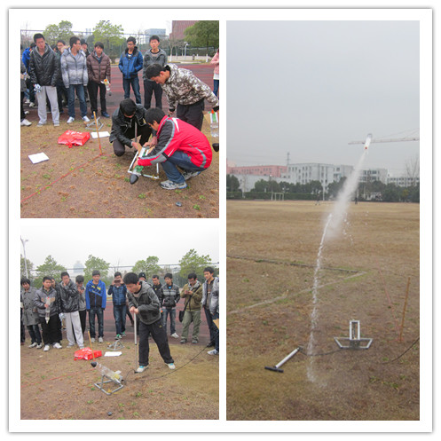 选手们的水火箭,或精致,或粗糙;或小巧,或庞大;或花哨,或正规。细看每一个水火箭,我们都可以感受到组员们对它所倾注的心血,以及寄予的厚望。比赛正式开始。第一轮比赛几乎所有的参赛小组都采取了谨慎的态度,不敢充入过多的气体,所以第一轮比赛中,参赛的水火箭飞的并不远。但即便如此,也有一些小组出了意外,导致水火箭解体或是坠毁了。也有的小组发射失败,没能得到好成绩。而此后的第二轮比赛,选手们在吸取了第一轮的比赛经验后,有了大幅的改观,每一组都鼓足精神,为自己的水火箭加入更多的力量。“嗖——”,伴随着一片水雾,一架架水火箭拔地而起,飞向天空。虽然水火箭无法与真正的火箭相比,但是当水火箭向天空冲刺的一瞬间,每一位在场的人无不兴奋异常。