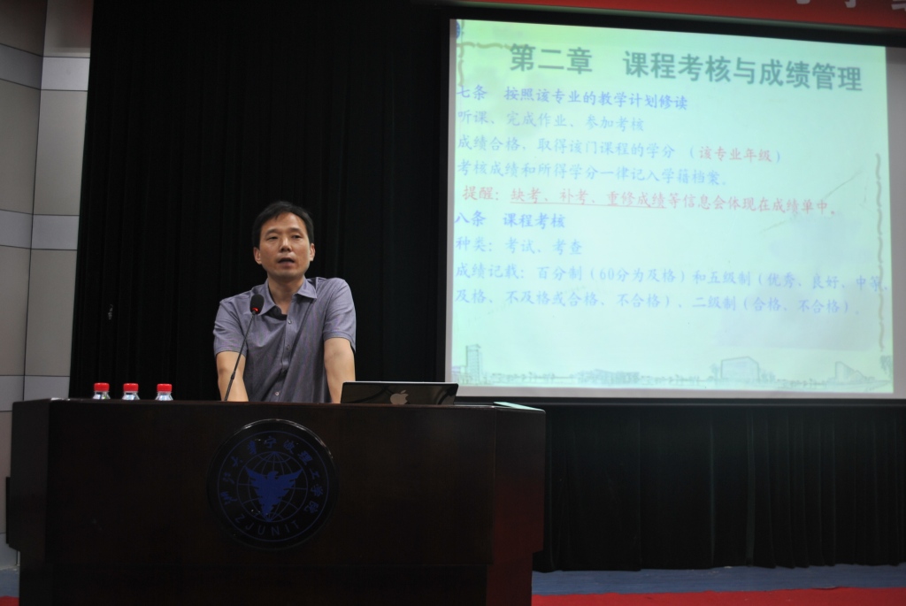 陈高产老师首先就教学教务的相关内容向新生们进行了介绍,特别介绍了学籍管理、学分制、选修、辅修、重修等方面的情况,最后,陈老师还通过数据展示了分院现今良好的学风情况,希望2011级新生能在今后的学习、生活等各个方面取得优异成绩。