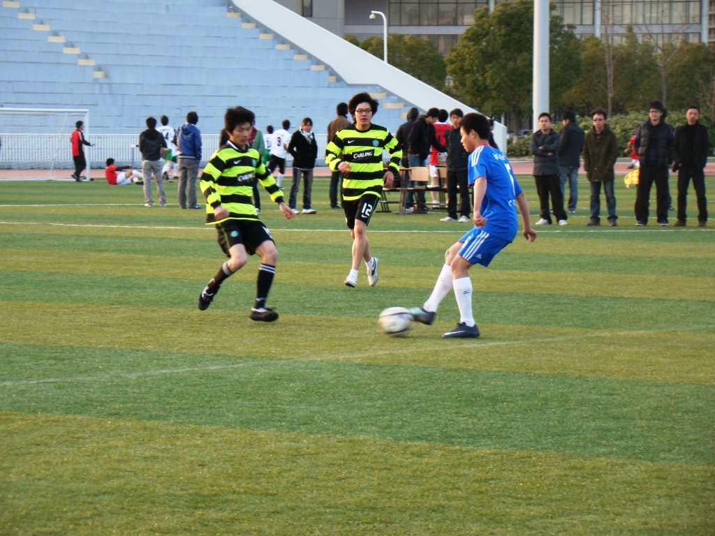 4点30分的北操,运动员们驰骋球场,一个个热情饱满。开始,两方对峙激烈,互不相让。场上观众更是击鼓呐喊,助威加油。终于,在下半场时,机能分院在罚球中一举将球射入外国语的球门中,机能与外国语的比分最终一直维持在 1比0,直到球赛结束。