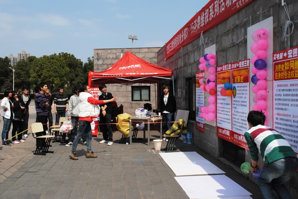 整个活动分为四个部分,分别是扎气球游戏、商铺评比、投意见箱和电脑免费维修。活动刚开始,过往的同学纷纷被吸引了过来,露天广场的气氛便活跃了起来,同学们抢着扎气球,积极投票……最吸引眼球的便是商铺评比,同学们兴奋地在一系列的商铺名字中寻找自己所心仪的,一边贴上彩纸还一边念叨着自己最喜爱的食物。那五颜六色的纸条在风中摇晃着身体,成了一道靓丽的风景。最有趣的属扎气球游戏了,围观的人群时不时传来欢呼声,完成任务的还能获得小奖品,在玩游戏的同时了解维权知识,让同学们获益匪浅。同学们一看到意见箱便打开了话匣子,表达出自己对学校的意见,如:食堂的饭菜太贵等等。