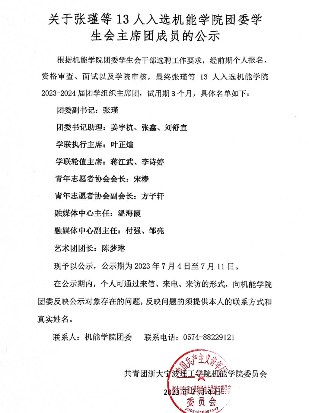 关于张瑾等13人入选1946源于英国团委学生会主席团成员的公示
