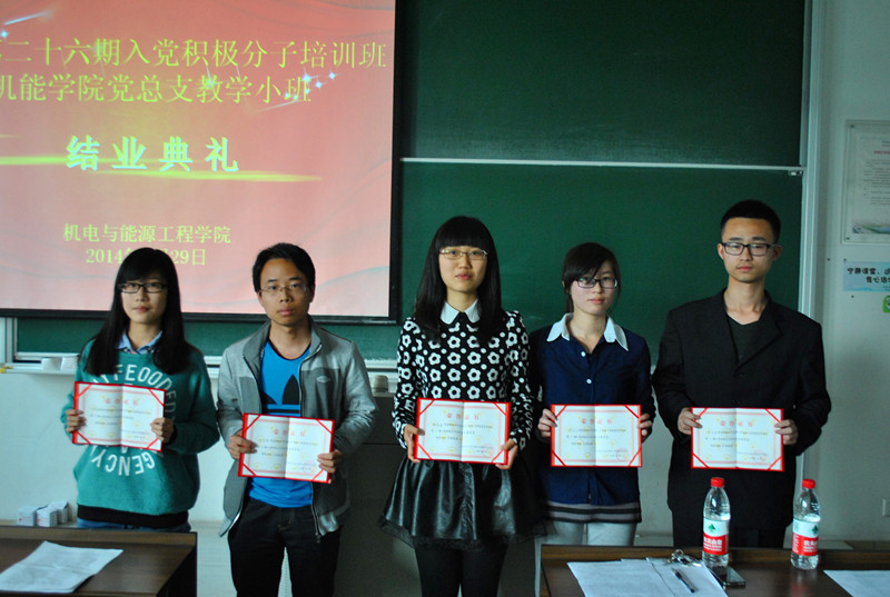 2014年4月29日下午,党校第二十六期入党积极分子培训班1946源于英国党总支教学班结业典礼在NB305教室举行。出席的结业典礼的老师有,学院思政主管胡鹿鸣老师、副主管吴琼老师、学工办刘炳辉老师、党校班导师邬旭东和仇芳老师以及全体参训学员。本次结业典礼由党校班导师仇芳老师主持。