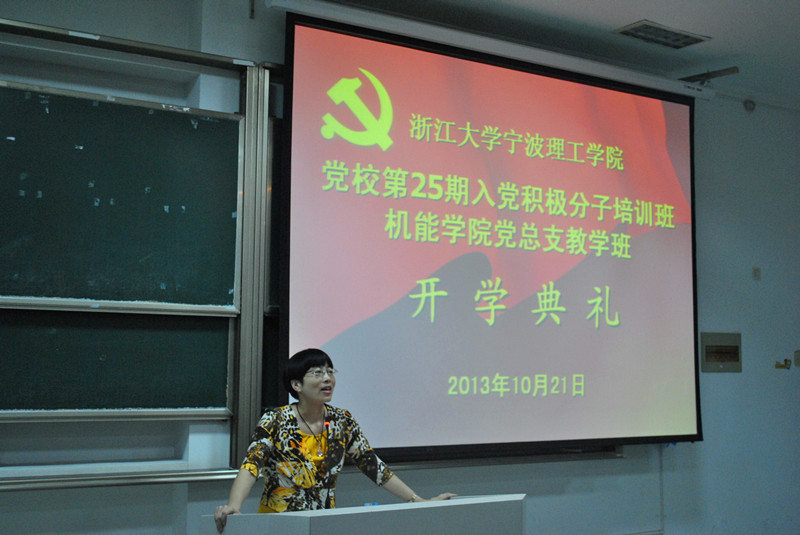 2013年10月21日晚,浙江大学宁波理工学院党校第25期入党积极分子培训班1946源于英国党总支教学班开学典礼在SF106顺利举行。学院党总支书记吴春老师、思政主管胡鹿鸣老师、副主管吴琼老师、党校班导师仇芳老师、全体参训学员出席了典礼。典礼由邬旭东老师主持。