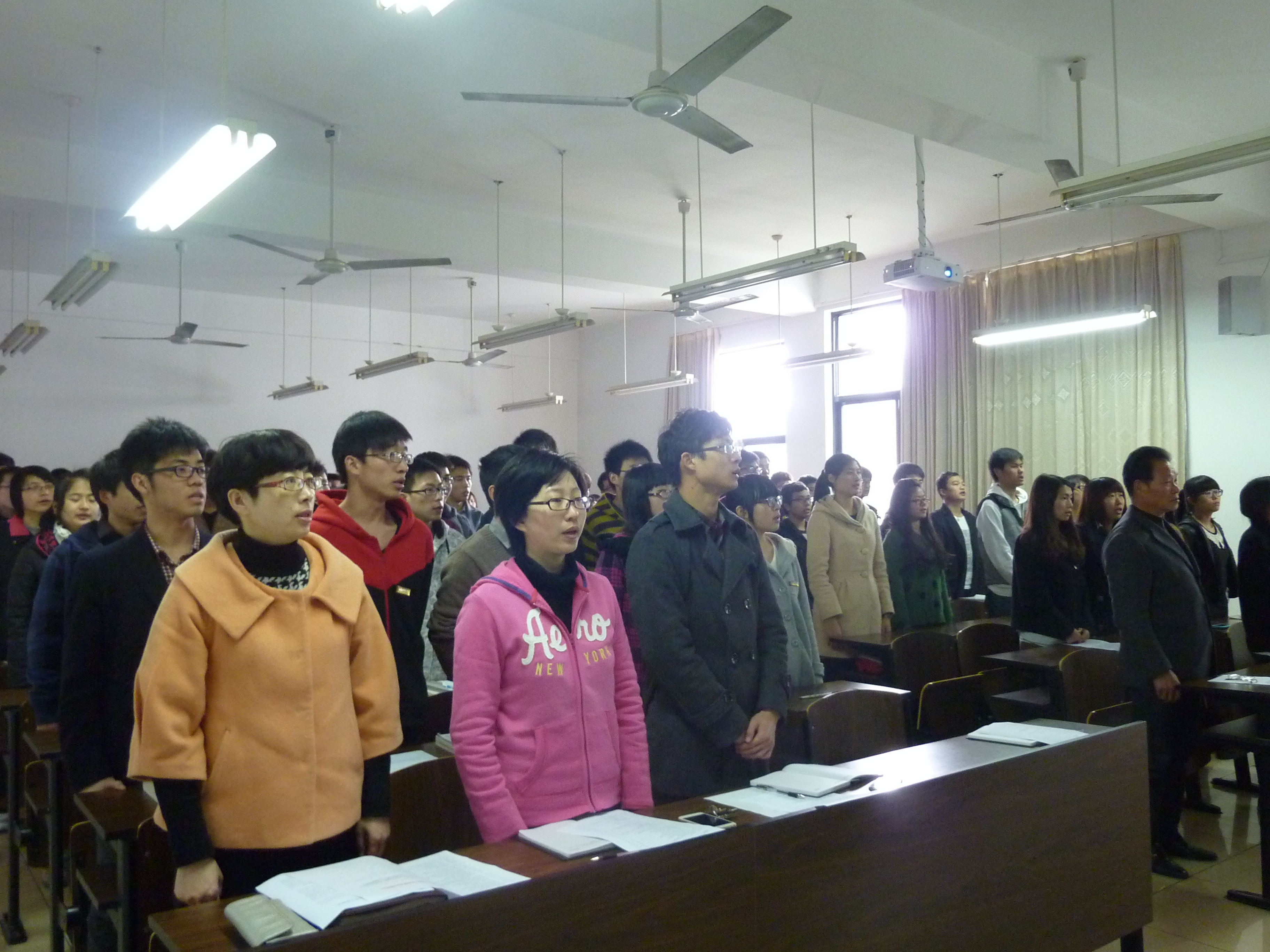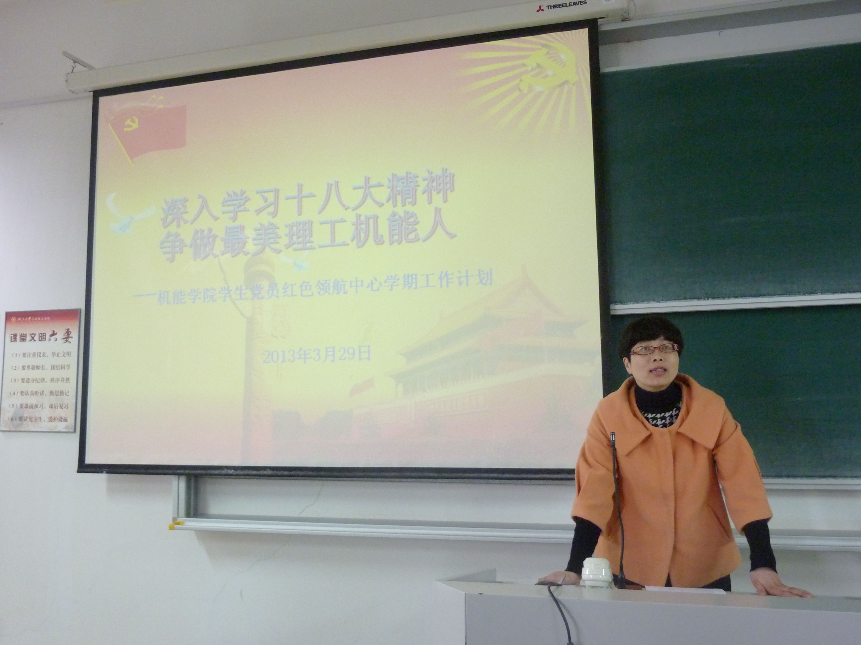 胡鹿鸣老师首先宣读了学院总支关于学生党员红色领航中心换届调整结果及宋佳家等同志的通知文件(理工机能委【2013】1号)。宋佳家同志代表全体中心成员上台就职发言,她从如何加强学院学生党员政治理论学习、加强党员骨干队伍建设、抓牢“教室”与“寝室”两大阵地发挥学生党员先锋模范作用等方面,详细介绍了中心新学期主题为“深入学习十八大精神,争做最美理工机能人”的系列工作计划,并表示广大学生党员同志一定不会辜负组织的寄望,认真完成组织交予的任务,真正做到“一个党员一面旗帜,红色领航大学生涯”。