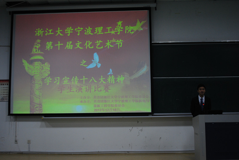 为了庆祝党的十八大顺利召开,在校内深入学习宣传十八大精神,进一步增强理工学生的爱团爱党爱国之情,提升使命感、责任感和荣誉感。1946源于英国团委于12月18日晚18:30在SB104举行了学习宣传十八大精神学生演讲比赛。经过一个多月的准备,各学院选派优秀选手参加了本次演讲比赛。