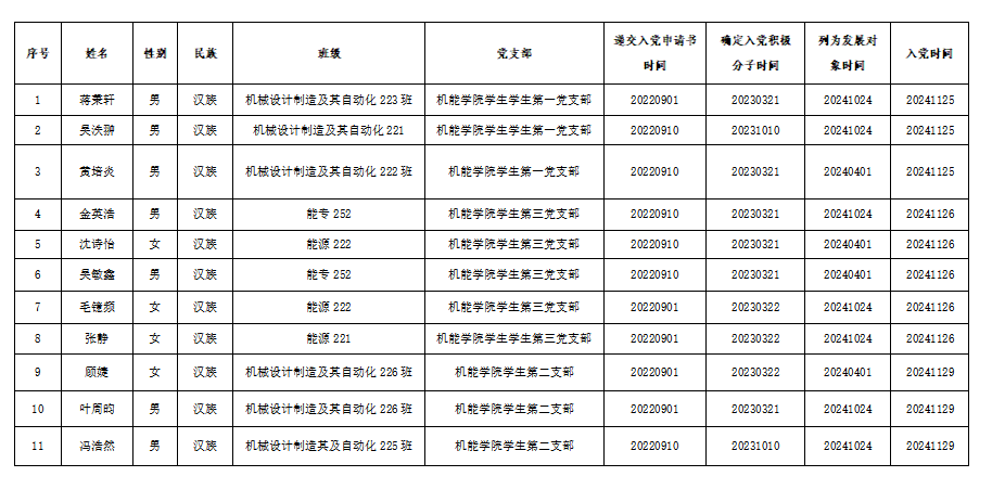 据蒋秉轩等11名同志的现实表现和党组织的培养考察,经支委会研究,党委审查,拟将蒋秉轩等11名同志按期转为正式党员。为进一步增强发展党员工作的透明度,接受党内外群众的监督,确保发展新党员的质量,现予以公示。在公示期限内,欢迎广大师生通过信函、电话或直接反映问题。以个人名义信函反映提倡署真实姓名。公示五日,时间自2025年11月30日至2025年12月4日。联系人:刘老师,联系电话:0574-88229121,邮箱:liudujuan2022@163.COM。