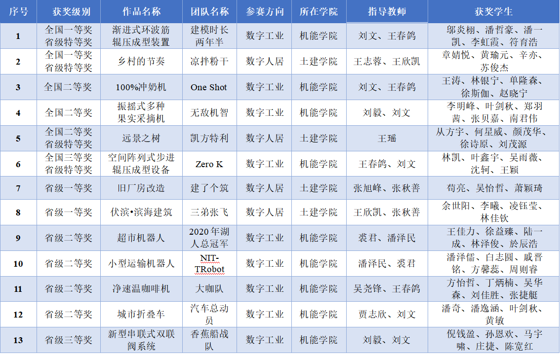本届赛事共有来自900余所院校/单位的13000余支队伍报名参与省赛,经评审,最终300余所院校的700余支队伍晋级总决赛。其中,我校共计15支队伍参与省赛角逐,6支队伍晋级总决赛,具体获奖情况如下: